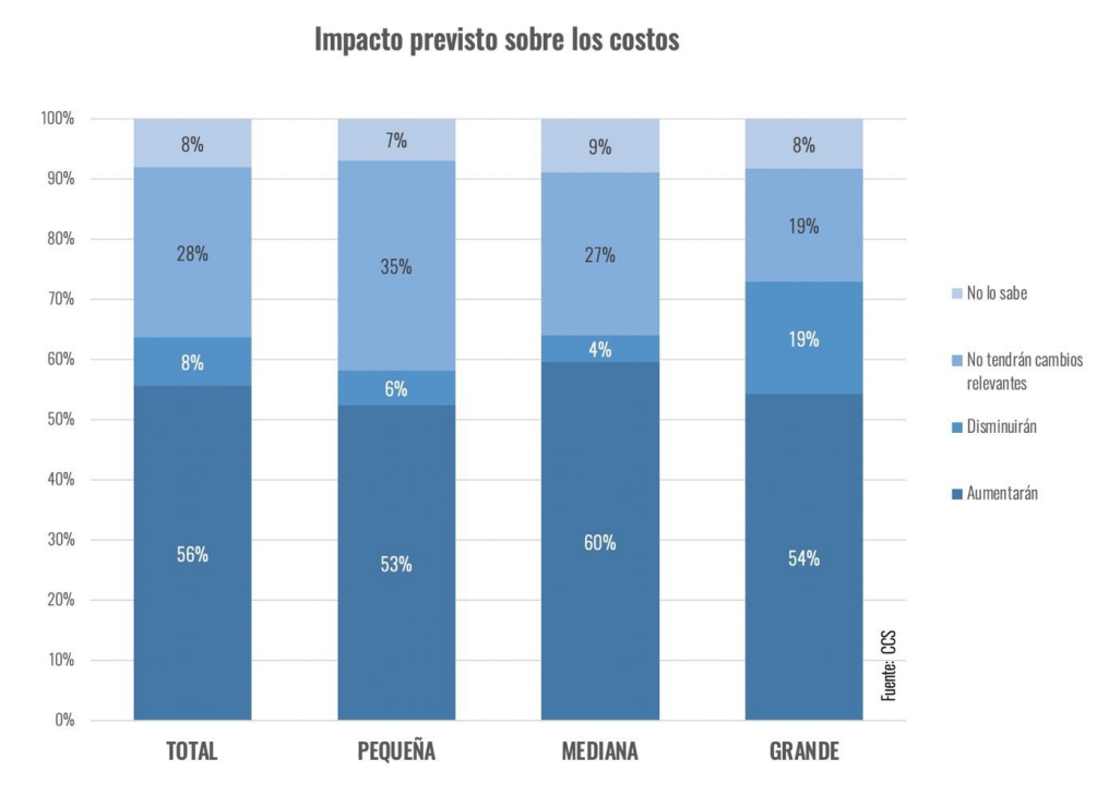 En materia de costos, un mayoritario 56% prevé que aumentarían con la nueva disposición, frente a un 28% que no espera cambios y un 8% que indica que disminuirían. En el segmento de medianas empresas es donde se aprecia una mayor proporción de afectados por el riesgo de un aumento de costos, con un 60%, 7 puntos por sobre el segmento de pequeñas empresas y 6 puntos por sobre las grandes.