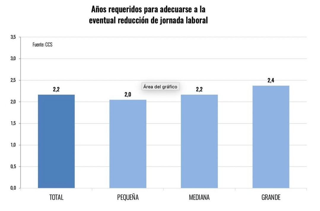 En cuanto al período de adaptación que se requeriría para la reducción de jornada, el promedio apunta hacia poco más de 2 años, lapso que aumenta levemente en el caso de las grandes empresas (2,1 años las pequeñas y medianas, 2,3 las grandes).