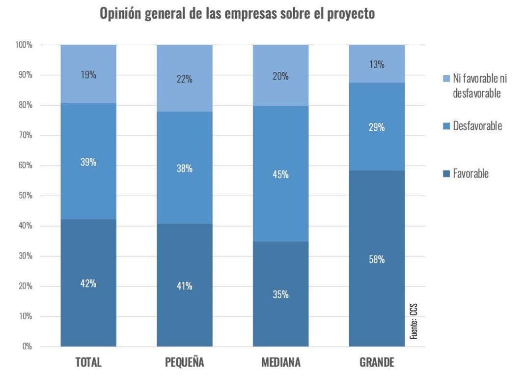 Finalmente, y pese a todos los potenciales impactos negativos que perciben ante su implantación, un 42% de las empresas manifiesta una opinión favorable en términos generales ante el proyecto, mientras que un porcentaje levemente inferior (39%), lo califica como desfavorable.