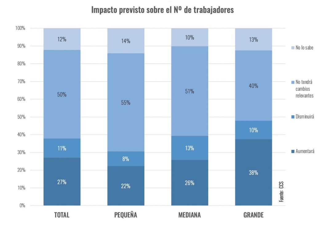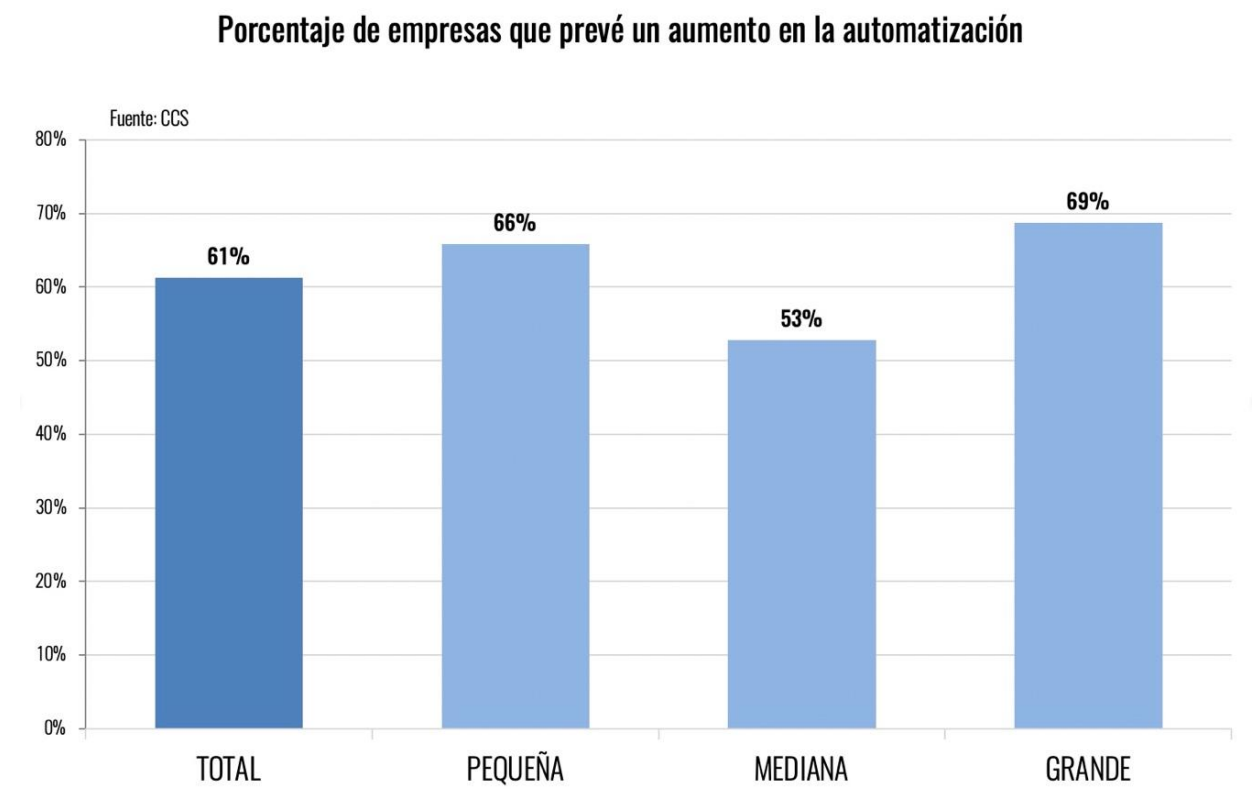 Donde sí existe un amplio consenso es en el impacto de la reducción de la jornada en los niveles de automatización de las empresas: un significativo 61% prevé una mayor automatización basada en herramientas digitales, que en el caso de pequeñas y grandes empresas se eleva hasta un 66 y 69 por ciento.