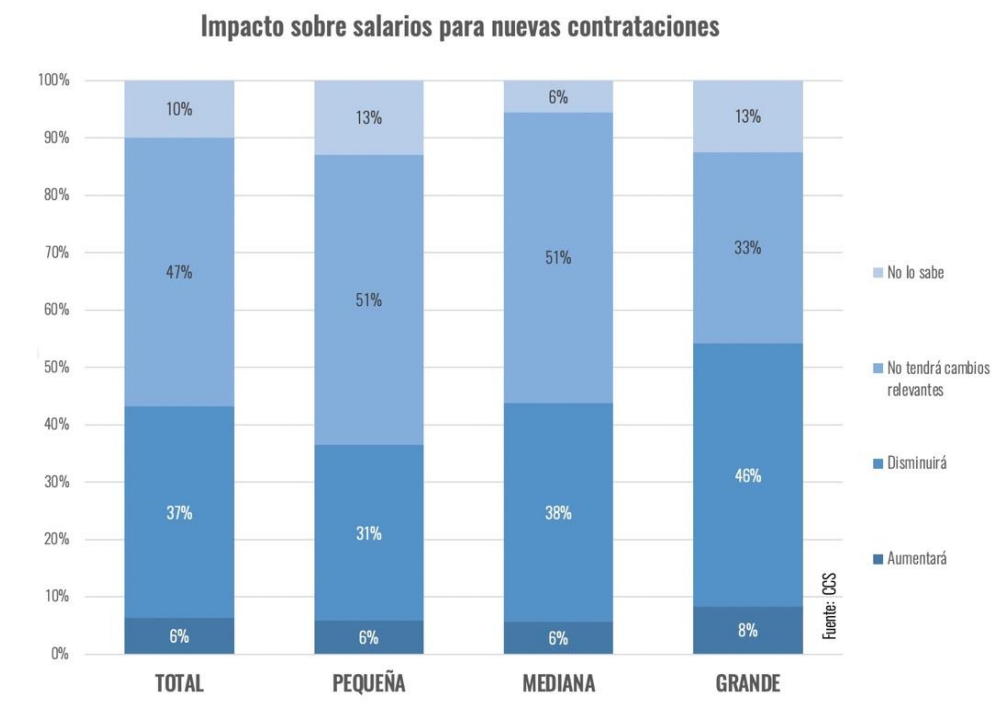 Respecto del comportamiento de los salarios, no se prevén cambios en las remuneraciones actuales, pero un porcentaje importante (37%) estima que las nuevas contrataciones experimentarán una disminución salarial. En el caso de grandes empresas, dicho porcentaje se eleva hasta un 46%.
