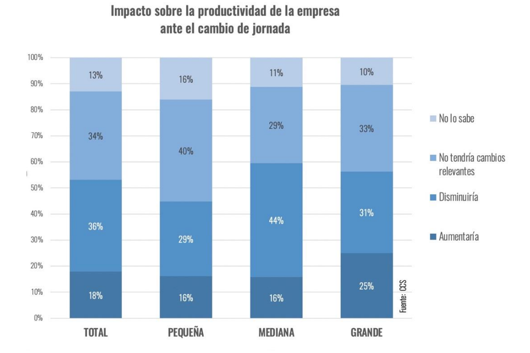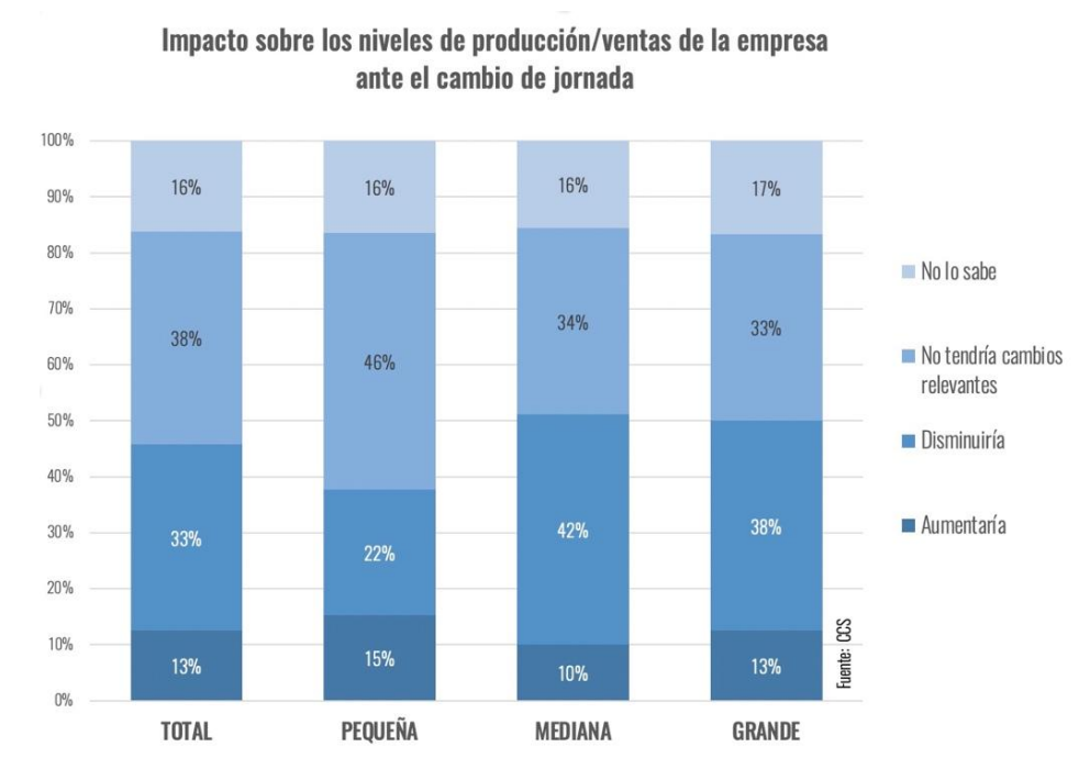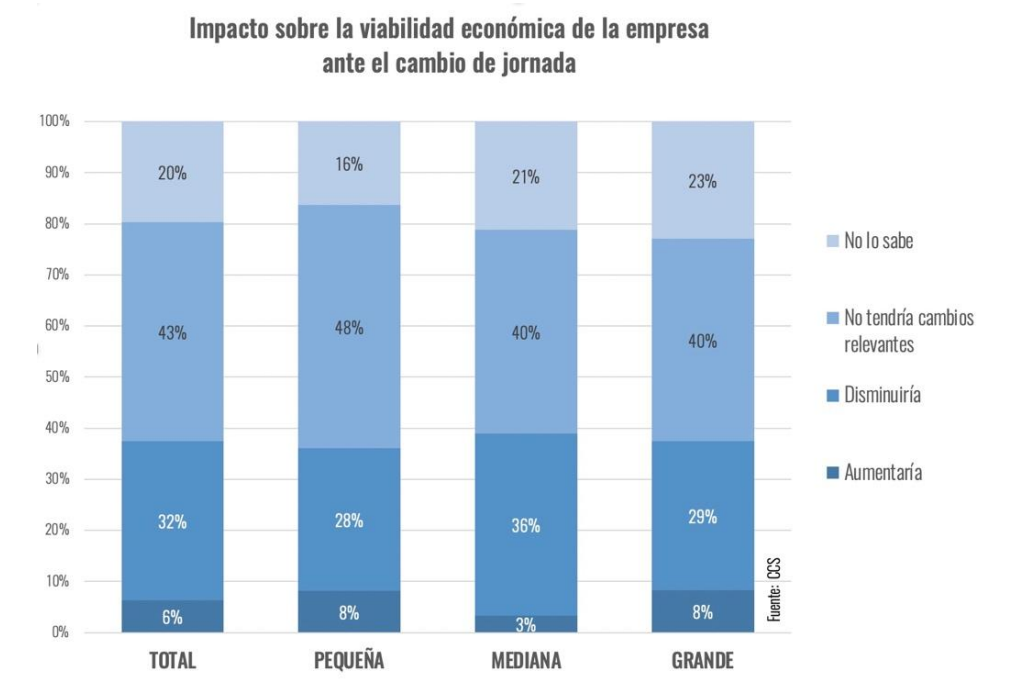 Un aumento en sus costos y una mayor automatización de funciones basados en herramientas digitales aparecen entre los principales impactos previstos por las empresas ante un eventual cambio de jornada laboral de 45 a 40 horas. Así se desprende de una encuesta realizada por la CCS entre 222 empresas de distintos tamaños y sectores económicos.