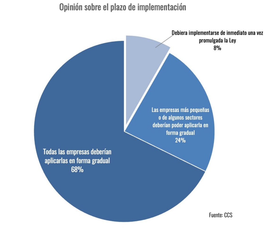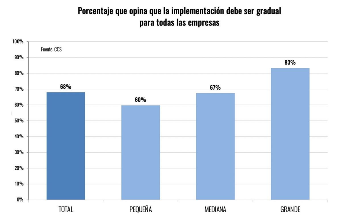 Respecto de la eventual gradualidad que se ha planteado para la implementación de la nueva norma, existe amplio consenso entre las empresas en el sentido de que debería darse un plazo de adaptación a todas, sin distinciones ni por tamaño ni sector de actividad. Más de dos tercios de los encuestados se manifiestan a favor de esa modalidad. Entre las grandes empresas la gradualidad sin distinciones tiene mayor popularidad, superando el 80%, mientras que disminuye en las medianas (67%) y pequeñas (60%).