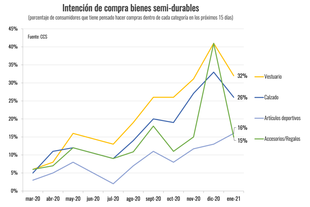 El factor estacional se aprecia con mayor fuerza en las áreas que tradicionalmente concentran las preferencias en Navidad, como accesorios y regalos, en que el indicador cayó de 41 a 15 por ciento de los consumidores. De este modo, la intención de compra en esta categoría volvió a los niveles observados en noviembre de 2020.