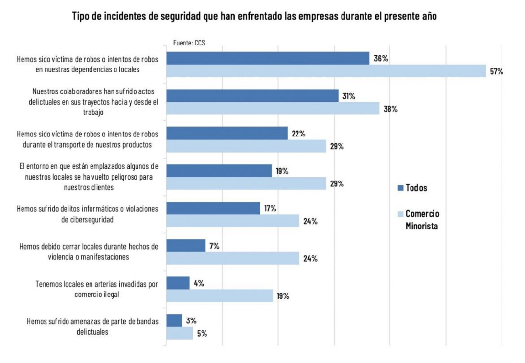 El robo de mercancías durante su transporte también es un tipo de incidente que se ha vuelto habitual para las empresas, afectando al 22% de ellas y a un 29% de las minoristas en el presente año. Para este último sector, los cierres forzados de locales durante manifestaciones o hechos de violencia llegan al 24% de las empresas, mientras que la invasión de la vía pública en que se ubican sus locales afectan al 19%.
