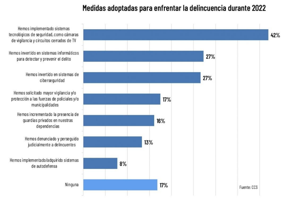 Ante estos riesgos de seguridad, las empresas han emprendido diversas acciones. La mayoría, un 42%, revela haber implementado sistemas tecnológicos de seguridad, como cámaras de vigilancia y circuitos cerrados, mientras un 27% ha invertido en sistemas informáticos para detectar y prevenir los delitos, misma proporción que ha adquirido sistemas de ciberseguridad.