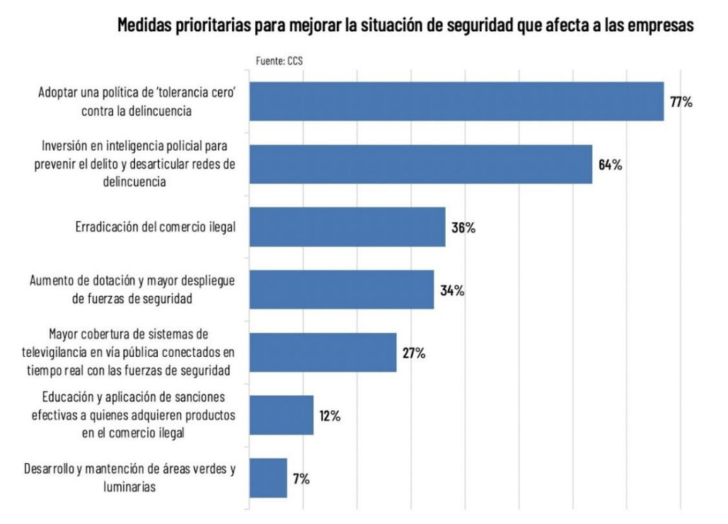 Al ser consultadas sobre el tipo de medidas prioritarias que se deberían impulsar para enfrentar esta situación, una clara mayoría de las empresas se inclina por adoptar una política de cero tolerancia contra la delincuencia (77%), y por aumentar la inversión en inteligencia policial para prevenir el delito y desarticular sus redes (64%).