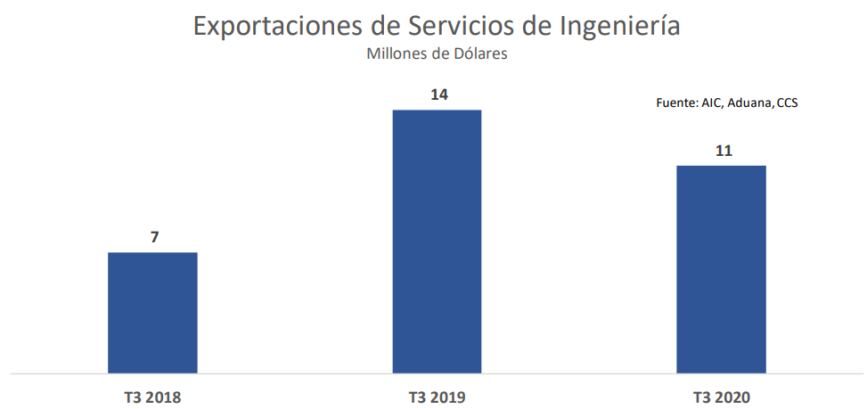 Asimismo, se observó que, en el tercer trimestre del presente año, el 100% de las exportaciones se concentraron en la materializaron de proyectos relacionados con los servicios de ingeniería para instalaciones de la minería extractiva del cobre.