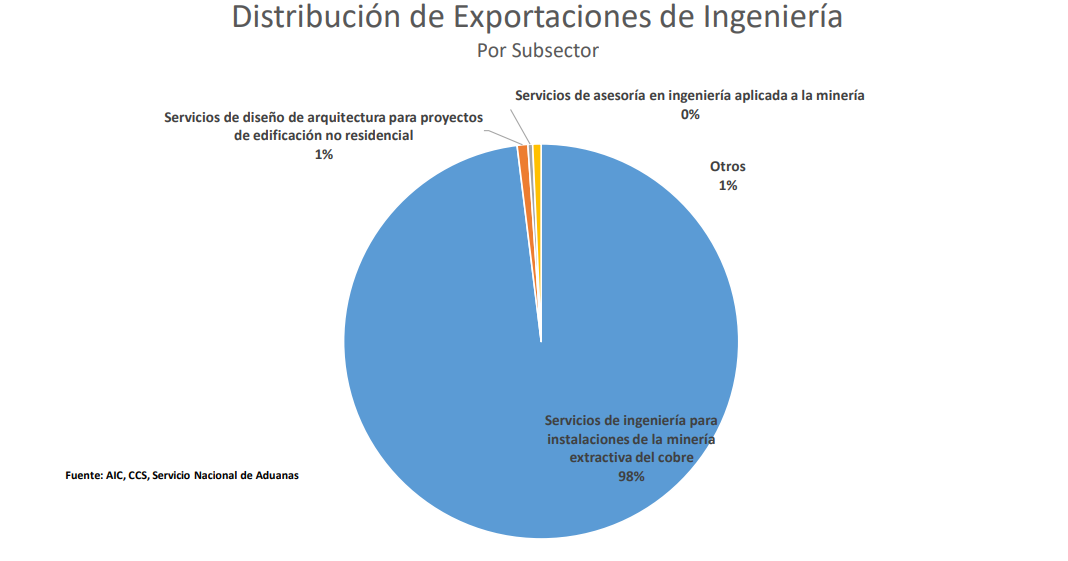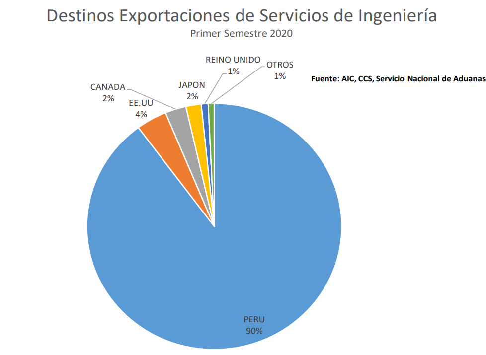 Pese a su fuerte caída, Perú sigue siendo por lejos el principal destino de las exportaciones de servicios de ingeniería chilena, con una participación del 90% sobre el total, seguido bastante más atrás por Estados Unidos, con un 4%.