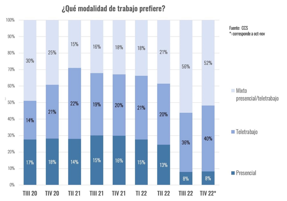 La proporción que se declara a favor de teletrabajar experimentó un fuerte aumento en los últimos 2 trimestres. Hasta mediados de este año, se mantenía por debajo del 90%.