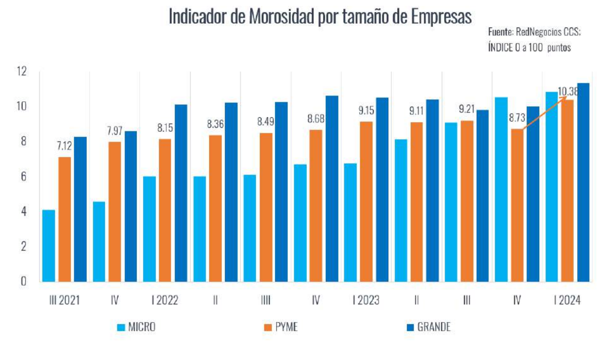 Al descomponer el Índice de riesgo general por tamaño de empresa, el segmento de PYMEs destacó por su deterioro, al registrar un importante aumento de 0,8 puntos en la primera parte de este año, alcanzando un índice de 8,09 puntos, el nivel más alto en todo el período de medición. El subindicador de morosidad explicó buena parte de estos resultados al registrar un ascenso de 1,6 puntos, en tanto el laboral se mantuvo respecto del último trimestre del año pasado.