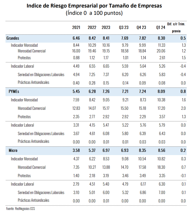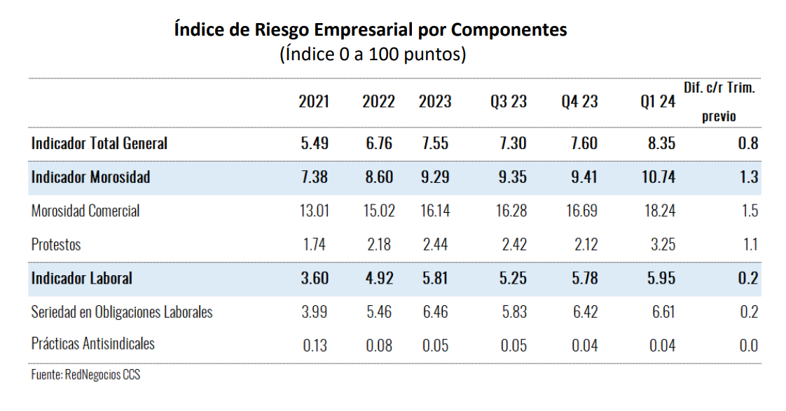 El Índice, que adopta valores entre 0 y 100 puntos, donde 100 representa el mayor nivel de riesgo, se elabora a partir de indicadores laborales (cumplimiento de obligaciones laborales y prácticas sindicales), y de morosidad (cumplimiento comercial y protestos). La metodología es aplicada a una muestra de algo más 7 mil empresas al mes, las cuales forman parte del registro de proveedores de RedNegocios de la CCS.